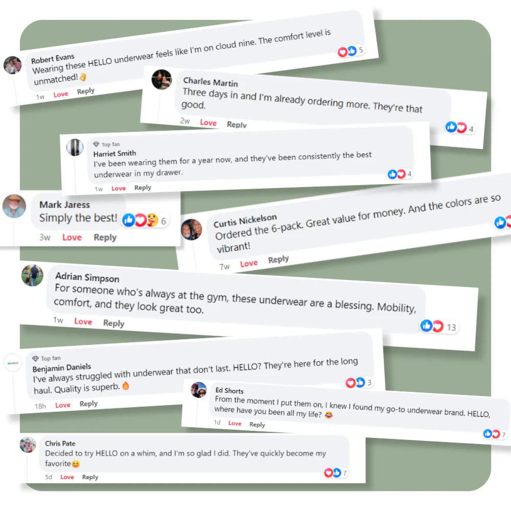 Join thousands of satisfied customers and try HELLO Underwear for yourself. It’s not just about wearing something new – it’s about experiencing a whole new level of comfort and confidence. Our unique fabric blend is incredibly soft, adapting to your body and giving you the freedom to move and breathe with ease. Try it and see for yourself why HELLO isn’t just underwear – it’s a simple upgrade to your everyday comfort, trusted by so many who’ve made the change.